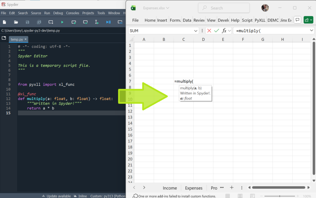 For Spyder users, PyXLL is the perfect Excel bridge for your Python code.
