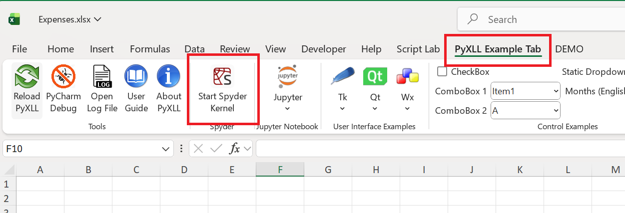 Once installed, PyXLL adds a new “Start Spyder Kernel” button to the Excel ribbon.